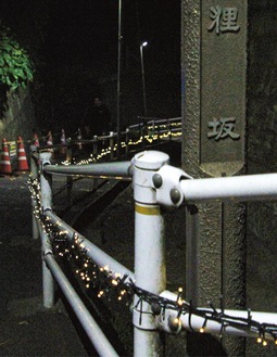 10月25日の狸坂への設置は、拠点を利用する小学生らと町内会の役員ら約30人が70m分を取り付けた。前回はイルミネーションタイプの明かりが弱かったため、電球が付く線を4重にし、より明るくなるようにした。ライトはセンサーによって昼間は消灯し、充電。暗くなると自動で点灯する仕組み。津ノ井さんは「坂の近くに住む方から感謝の言葉をいただいている」と手応えを語る。