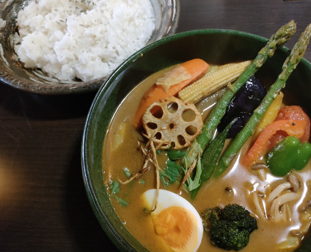 吉野町3丁目交差点そばに2022年9月にオープンした「アジアンスパイスレストラン&カフェーサモサ」。スープカレー(カリー)のお店です。見た目も美しい「13種の色彩野菜カリー」(1,180円)はアスパラガスやナス、レンコンなどの野菜がたっぷり。意識しないと野菜不足になりがちなので、こうしたメニューはうれしいです。ライスからナンへの変更はプラス50円です。
