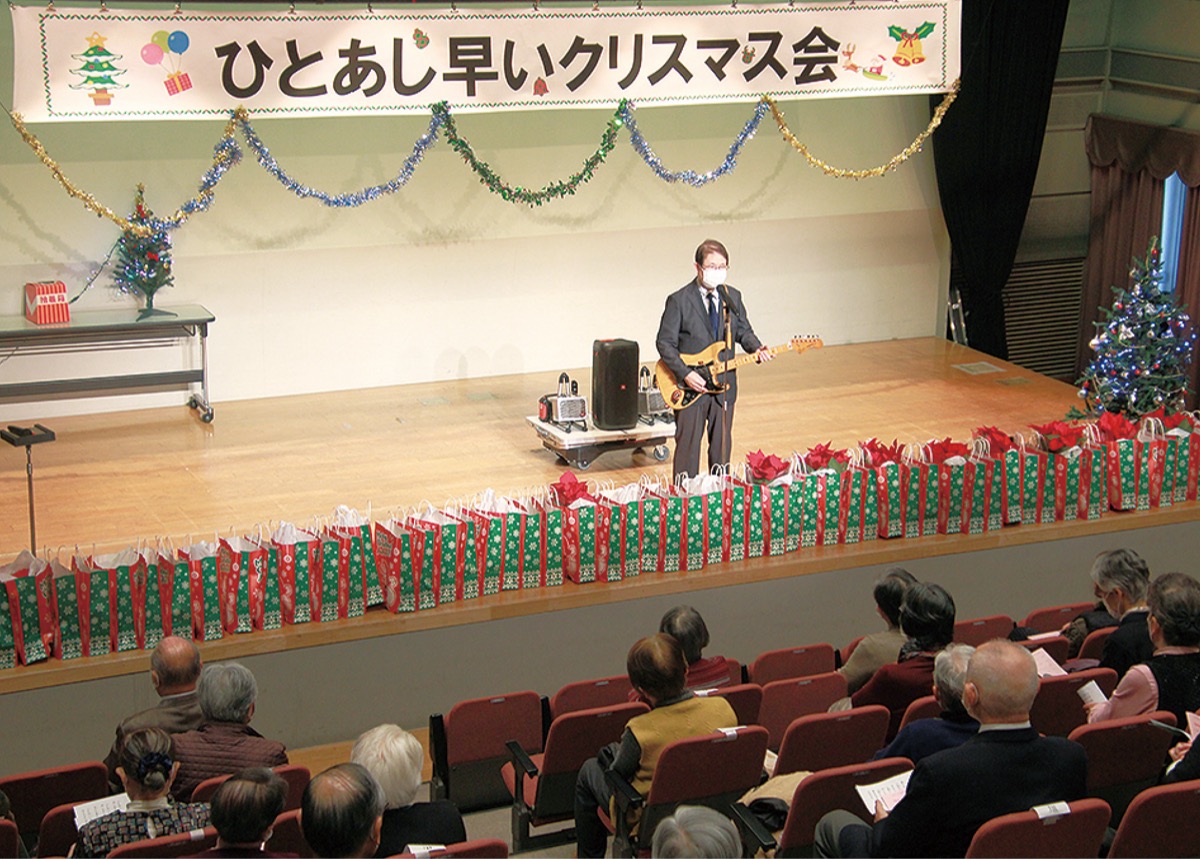 エレキギターの演奏を聴き、クリスマスソングを歌ったほか、抽選によるプレゼントもあり、主催者と参加者が一体となって盛り上がった。