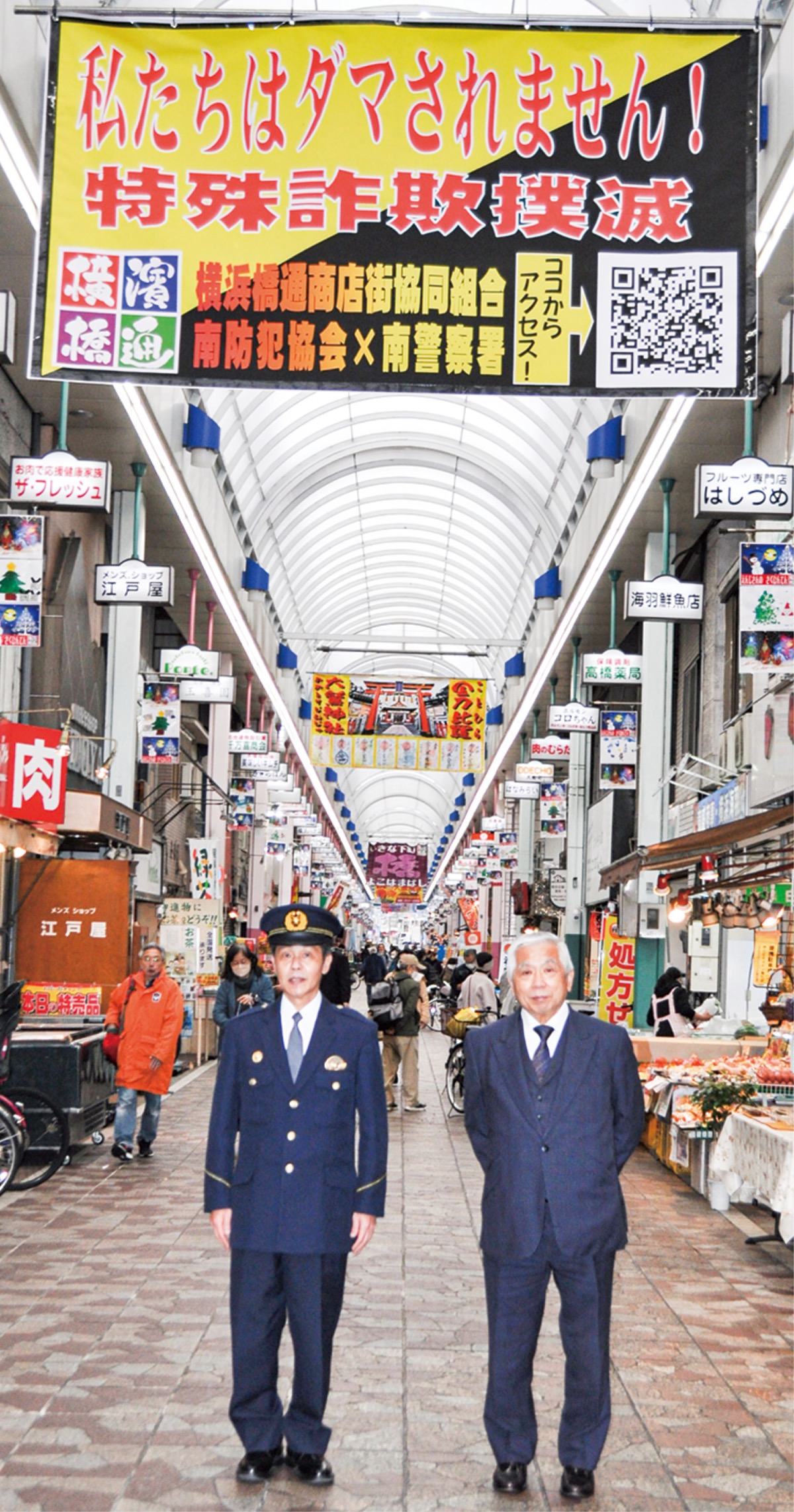 横浜橋通商店街(高橋一成理事長)は12月6日、買い物客をオレオレ詐欺などの特殊詐欺から守ろうと、詐欺撲滅を訴える横断幕を掲示した。