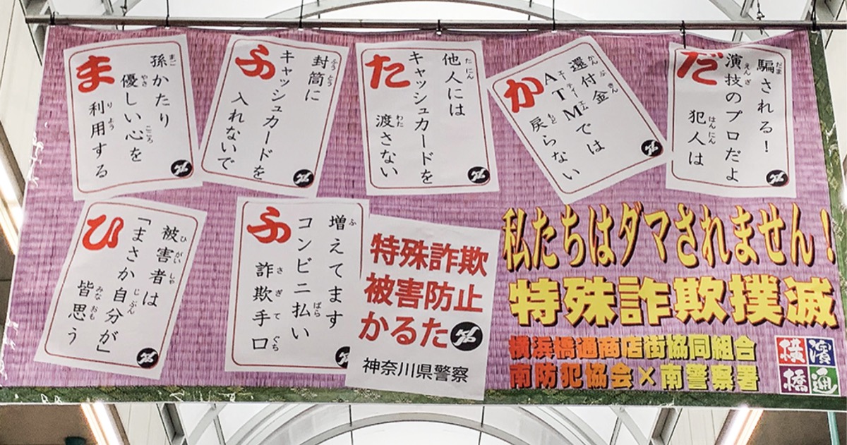 同商店街が南防犯協会、南警察署からの依頼を受けて作ったもの。縦2・2m、幅3・4mに及び、「私たちはダマされません」というメッセージや特殊詐欺の防止対策をまとめた県警のウェブサイトにつながる二次元コードを導入。横断幕の裏側には、神奈川県警が作成した「特殊詐欺被害防止かるた」の一部を紹介している。