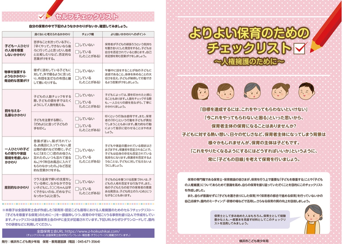 市は以前から不適切な保育を未然に防ぐための取組を行っている。全国保育士会が保育の質向上を目的に作った資料をもとに、「よりよい保育のためのチェックリスト」を発行。保育者主体の保育を指摘し、子どもの人格を尊重した指導法やアドバイスが記されている。市内にある保育施設のほか、幼稚園にも配っている。