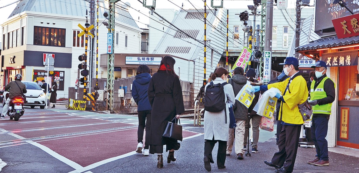 京浜急行電鉄は12月20日、踏切事故の防止を呼び掛けるキャンペーンを京急弘明寺駅前の「井土ヶ谷第1踏切道」で南交通安全協会、南警察署と合同で行った。寒空の中、関係者は啓発物を通行人に配り、安全意識向上を訴え掛けた。