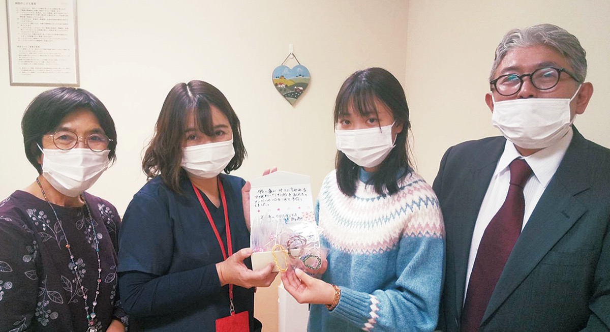 当日は新田代表ら団体スタッフが同センターを訪問。病院職員にミサンガと収益金を手渡すと、職員から感謝の言葉が送られた。