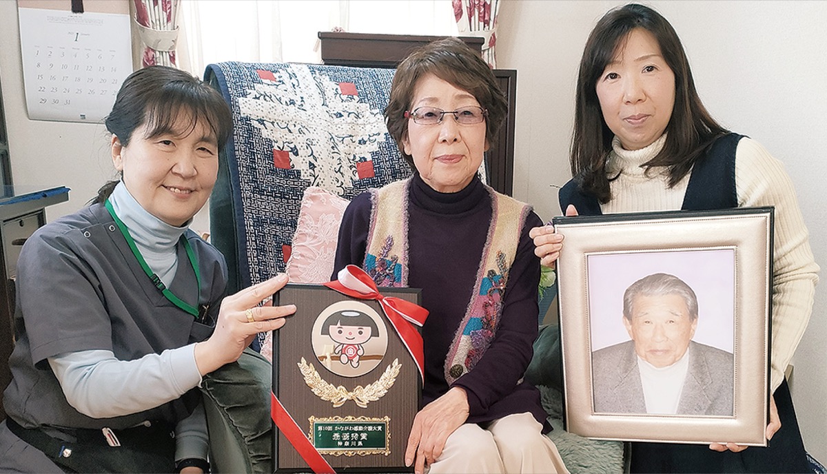 大岡3丁目の施設「看護小規模多機能 みのり大岡」で夫が看護を受けた港南区在住の吉備育子さんが綴ったエピソードがこのほど、県の「かながわ感動介護大賞」の最優秀賞を受賞した。障害によって意思表示ができず、施設へ通うことに後ろ向きだった夫が職員の献身的な看護で前向きになったことに感謝した内容。夫は他界したが、吉備さんは「良い施設、職員との出会いで私や家族が救われた」という。