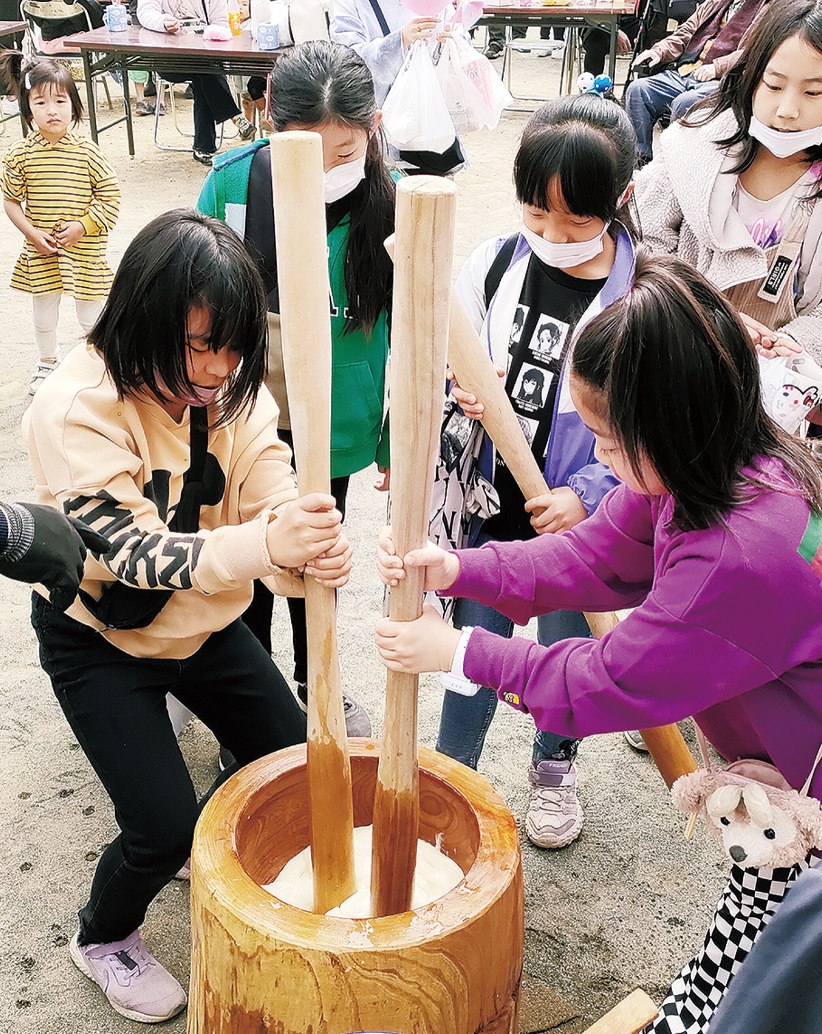 各町内会や地区内の団体が焼きそばや焼き鳥、カレーライスなどを販売。スポーツ推進委員は餅つきを行い、参加した子どもたちも杵を手にした=写真=。
