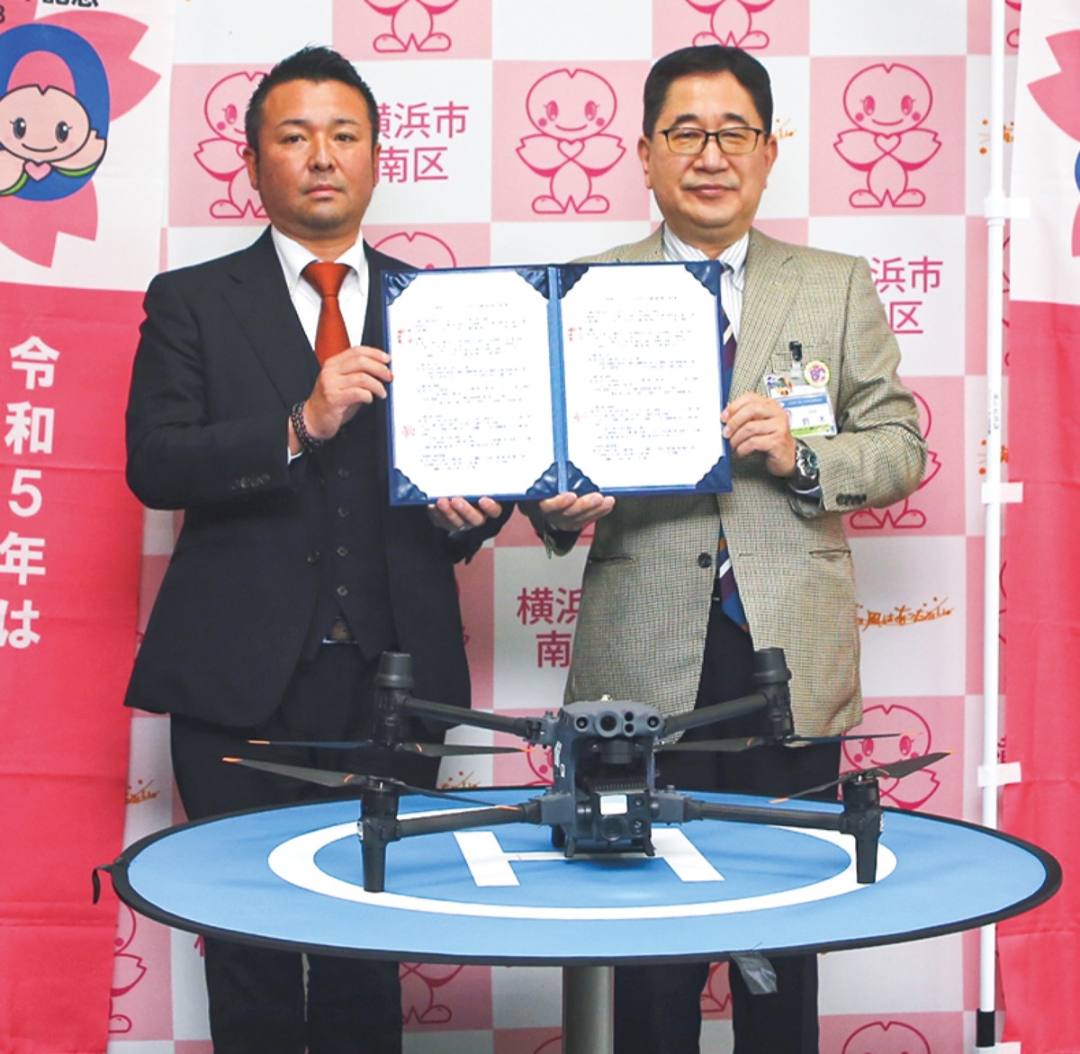 昨年2月、神奈川県ドローン協会と横浜市が災害時のドローンを活用した支援活動に関する協定を締結。保土ケ谷区でも12月にドローンを所有する建設業者が区と同様の協定を結んでいた。この流れを受け、小俣組も地域貢献の観点から南区に相談・提案し、協定が締結された。