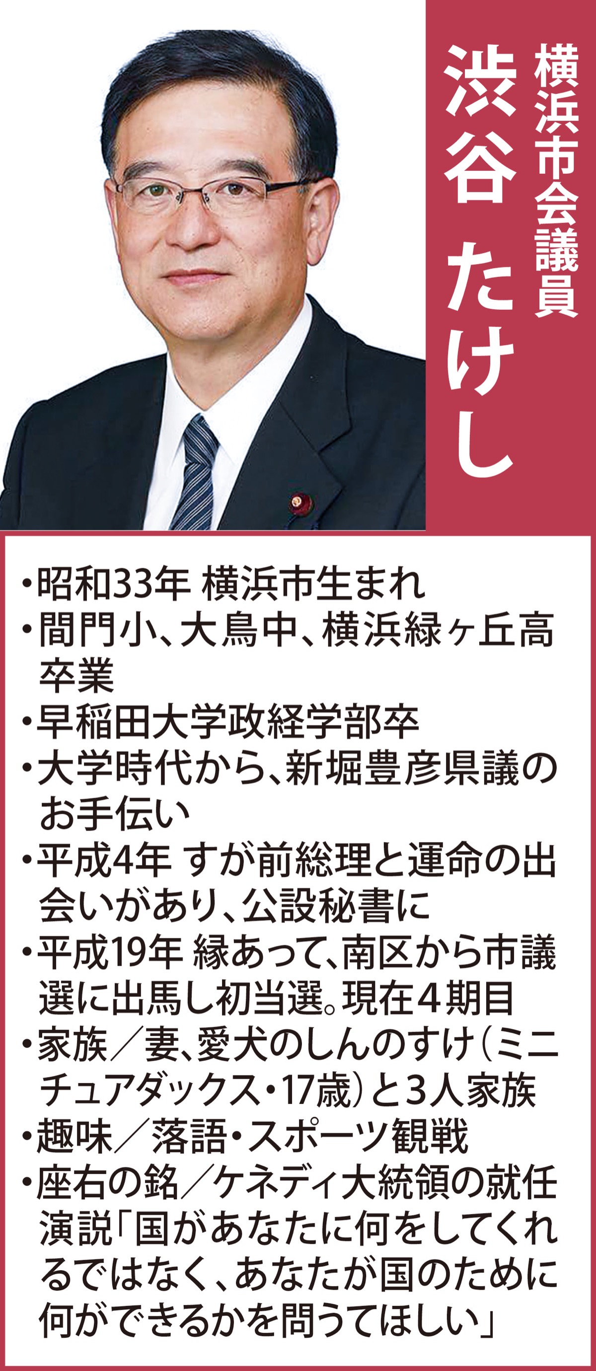 すが 私が横浜市会議員から国会議員になって、いつも思うことは、横浜という街は本当に大きな可能性を秘めた素晴らしい街だということです。その横浜の市会議員だったことは、私の誇りであり原点です。渋谷も、政治家としての原点をしっかり胸に、これからも市会議員として全力で取り組んで下さい。