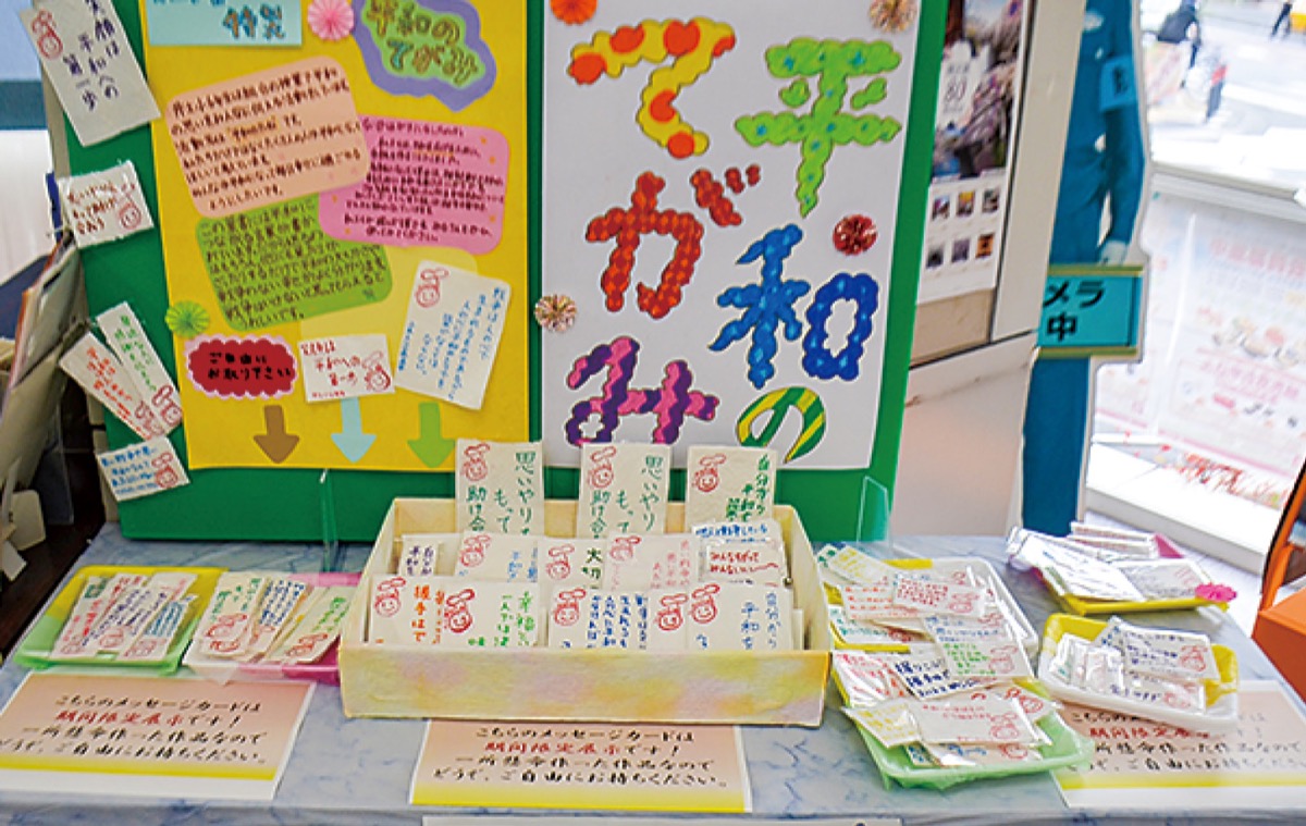 南郵便局は地元の幼稚園や小学校との交流を大切にし、子どもたちの活動を応援している。井土ケ谷小学校の6年生が総合学習で作ったメッセージカード「平和のてがみ」を4月7日まで展示予定。平和への思いを綴ったカードが地域住民の心に響いている。