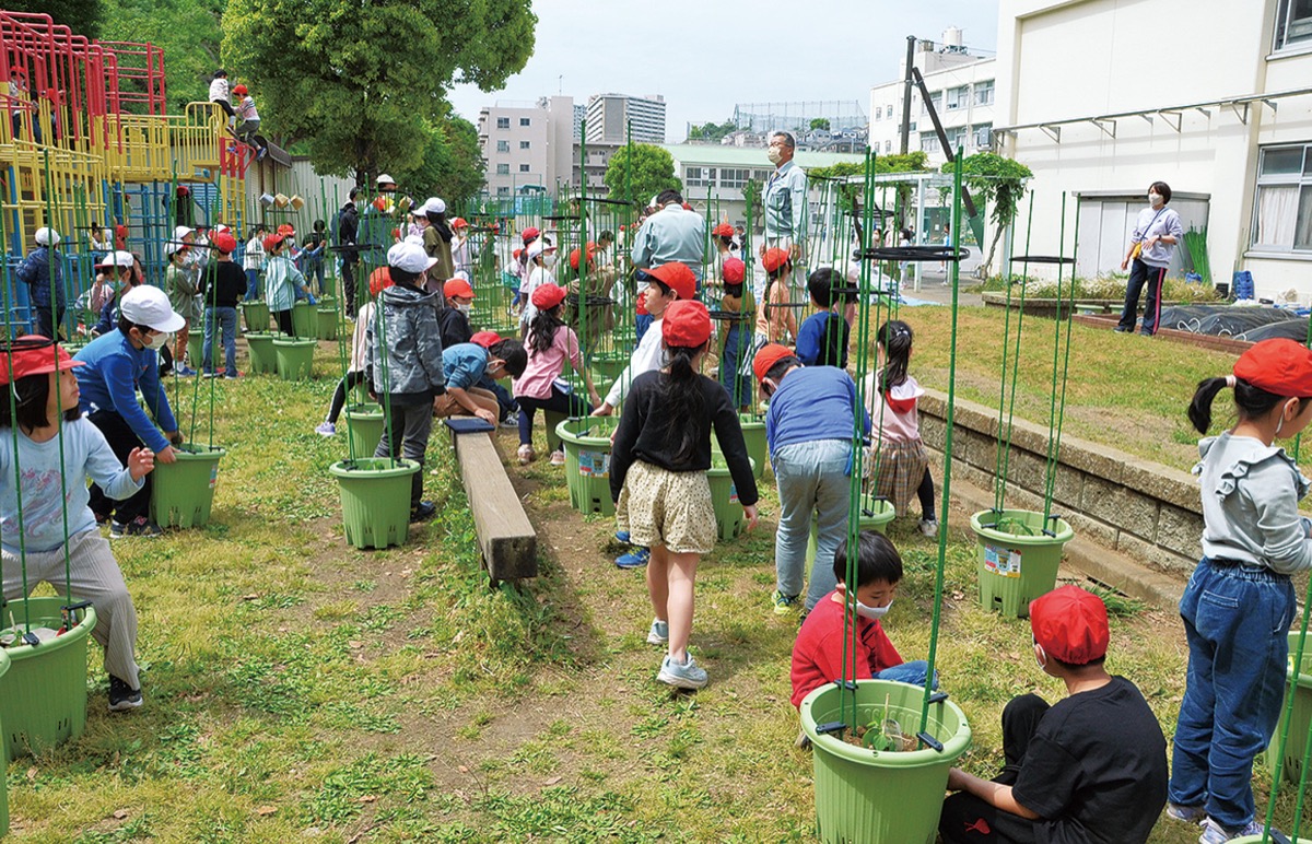 唐沢の園芸会社「横浜植木株式会社」(伊藤智司社長)が市立永田小学校と永田台小学校に野菜苗を寄贈し、4月25日に永田小、27日に永田台小で児童と一緒に植える作業を行った。
