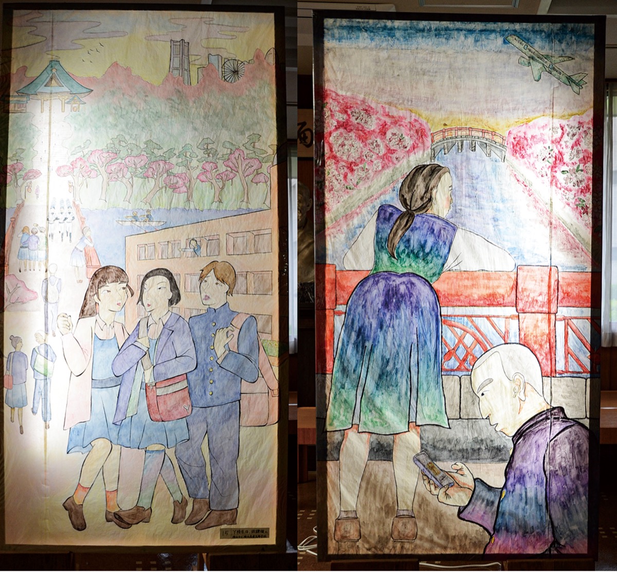 2人はY校のすぐそばを流れる大岡川をメインに模写し、高さ約1.7mの作品が完成。校舎から見える横浜ランドマークタワーなども描き、野球部やボート部の部員が練習に励む姿を表したという青春のワンシーンと調和させた。また、実際に見た景色だけではなく、想像を取り入れたシーンも。飛行機から見える南区の街並みをイメージし、大岡川と商店街が合わさったオリジナリティーあふれるまちを表現した。顧問の志村冬佳教諭は「2人は何度もシミュレーションを行っていた。地域の魅力を表現した作品になったのでは」と生徒を称えた。