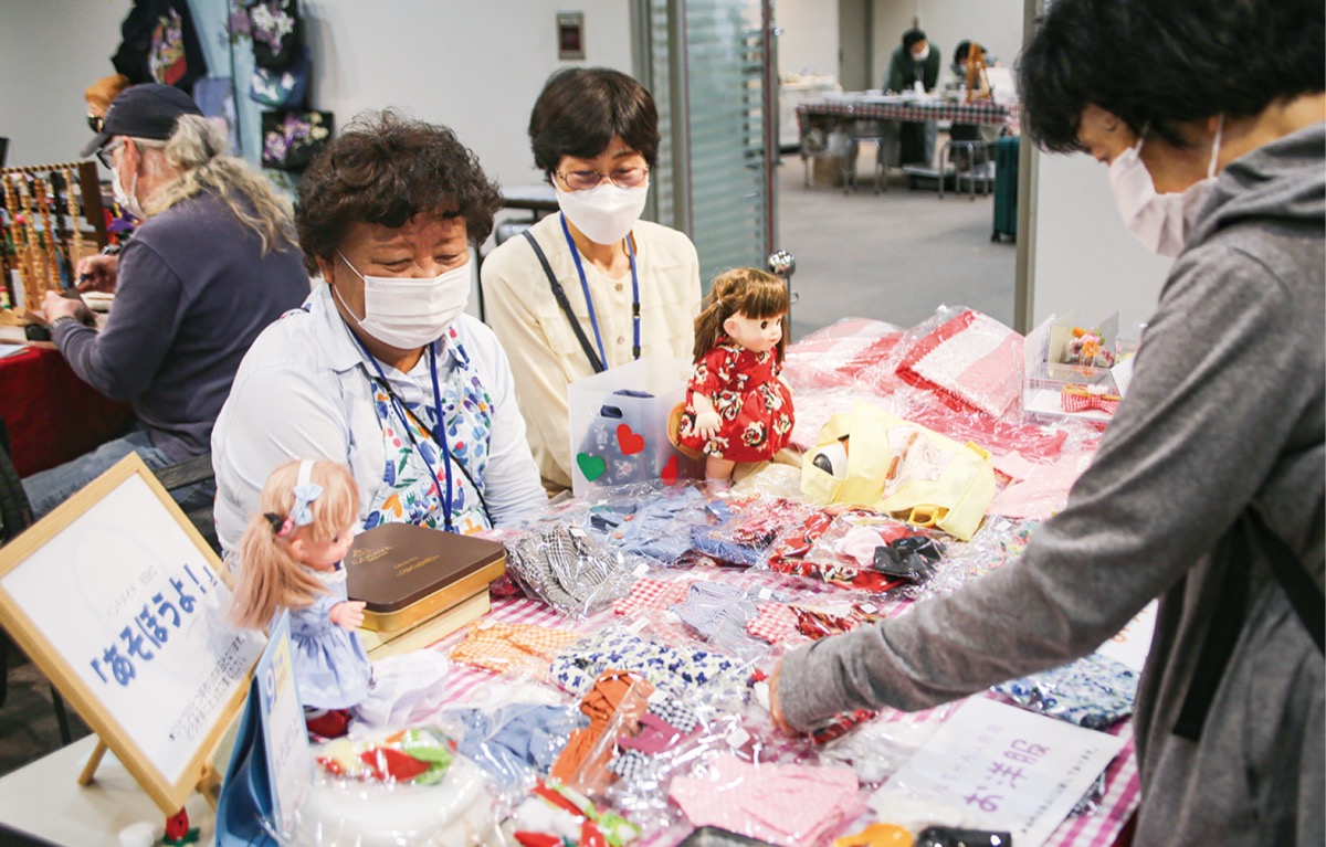 2日間で布小物や雑貨、アクセサリーなどを扱う約40ブースが参加。3日に出店した日枝町在住の宮沢敬子さんは元保育士で、幼児向けの布小物などを販売した。趣味の作品を身近な場所で販売できる機会があったことから参加したという。「子どもが楽しむ姿が見たくて、今までは作ったものを保育園に寄付したり、知人にプレゼントしていた」と話し、今後も機会があれば出店したいとした。