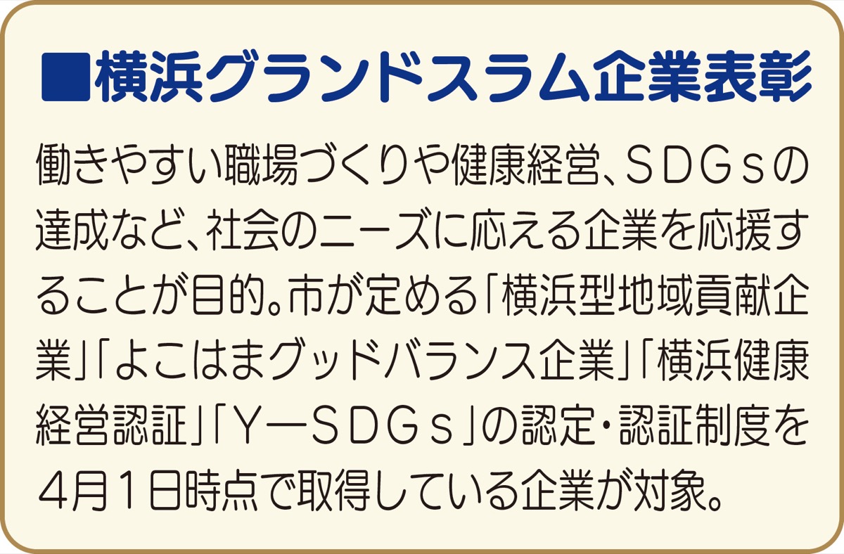 地域貢献をしながら経営に取り組む企業を横浜市が称える「横浜グランドスラム企業表彰」が6月に発表された。南区の6社を含む市内79社が選出された。南区の企業の取組を紹介していく。