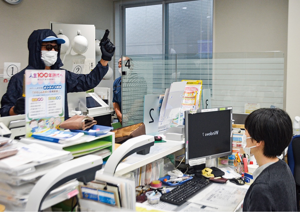 川崎信用金庫南太田支店が強盗の侵入に備えた訓練を9月15日に行った。訓練後、南警察署の警察官から訓練の総評をもらい、適切な対応だったかを振り返った。