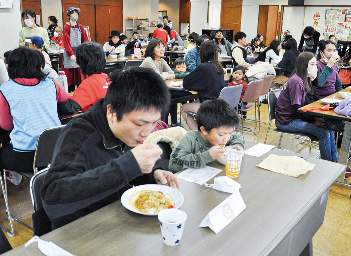 この日は食後にクリスマス用の飾りを作ったり、クリスマスソングを歌ったりして交流。親子連れでにぎわい、初対面の住民同士もすぐに打ち解けていた。参加者の親子は「地域のつながりを感じられるこども食堂で、また機会があれば参加したい」と話した。