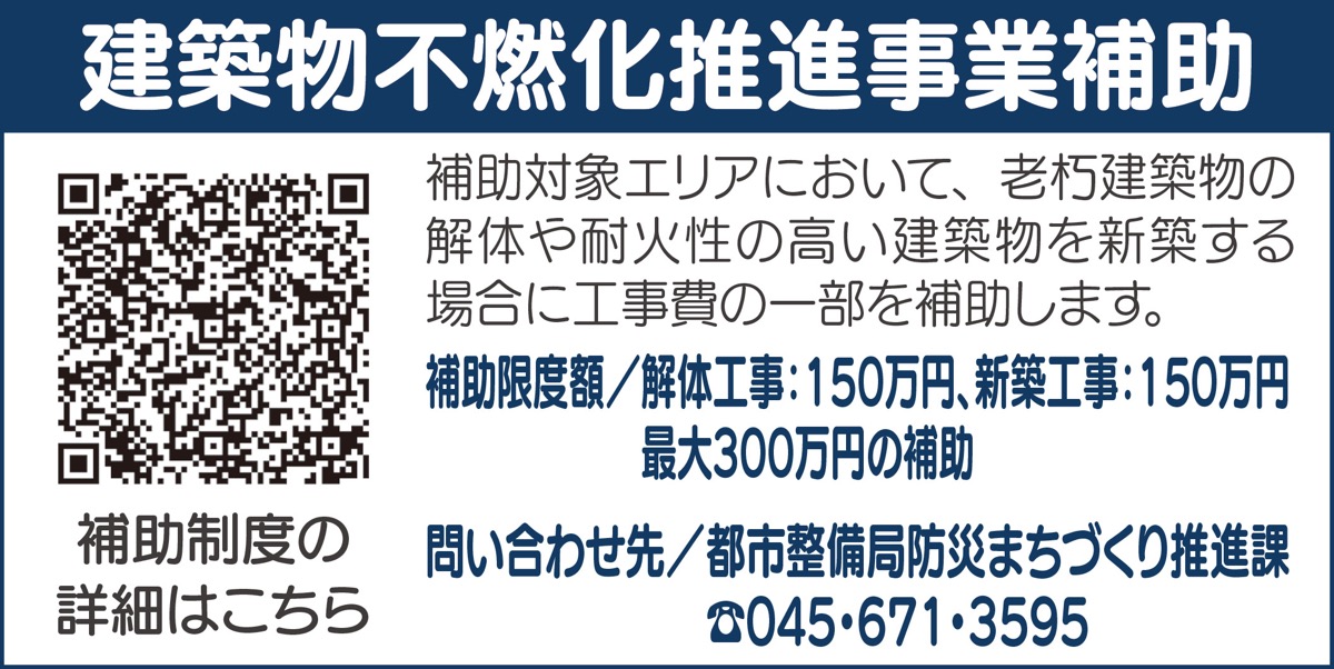 横浜市は、燃えにくく・住みやすいまちを目指し、古い建築物の解体や耐火性能の高い建築物の新築に合計最大300万円までの補助を行っている。
