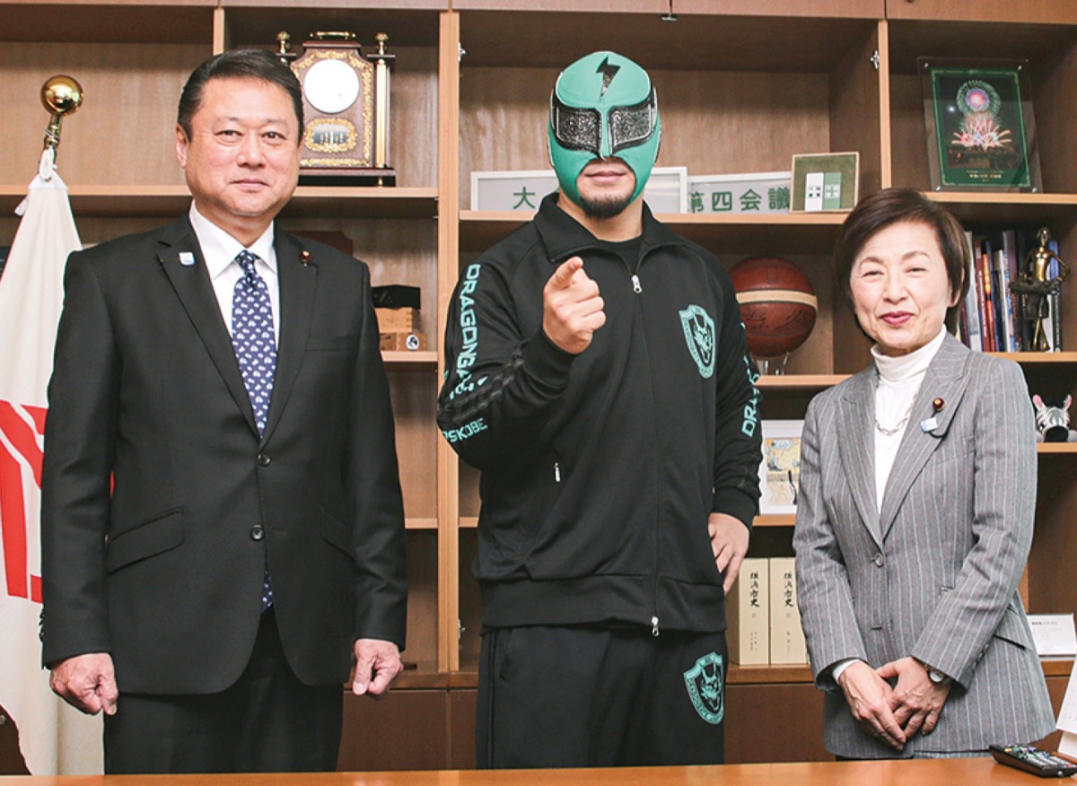 プロレス団体「ドラゴンゲート」が1月27日に横浜武道館大会を開く。大会を前に横浜出身のストロングマシーン・J選手が横浜市会の瀬之間康浩議長と福島直子副議長を表敬訪問した。