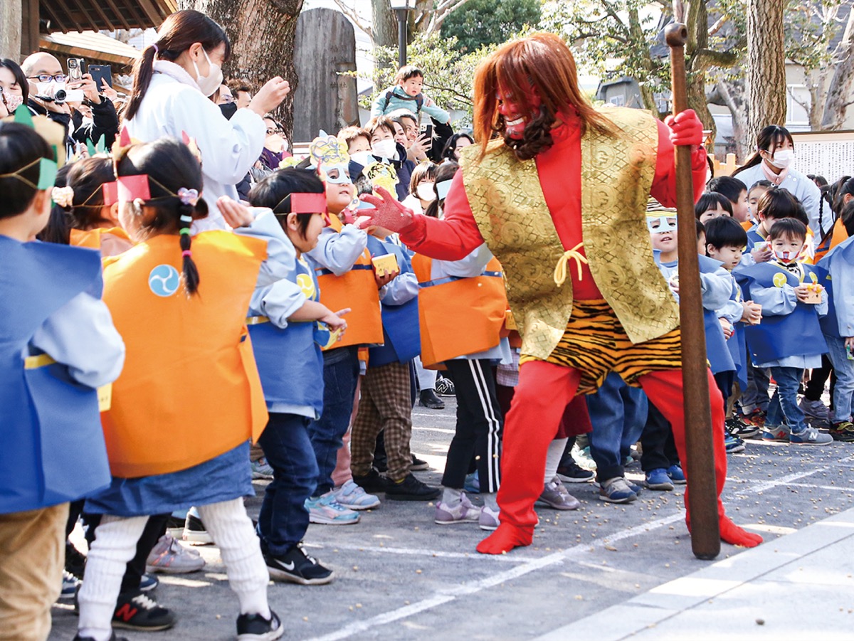 境内に赤鬼が現れると、園児が「鬼は外」と大きな声を出しながら、豆を勢い良く投げ付けた。前後から豆を投げられた鬼は逃げるように退散した。その後は袋に入った福豆が配られ、園児の保護者や参拝客など約500人が豆を受け取った。