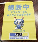中村町の自動車学校「神奈川ドライビングスクール(KDS)」とサッカーJ2の「横浜FC」が3月21日、交通安全のために、市立永田小学校(足立渉校長)のPTA(增子久江会長)にオリジナルの横断旗を寄贈した。