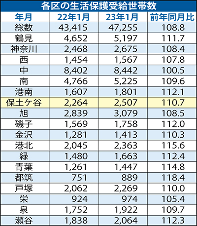 今年1月現在、横浜市内で生活保護を受けているのは4万7255世帯(6万4943人)で、前年同月と比べて8・8%の増加。市内すべての区で増加している(左表参照)。