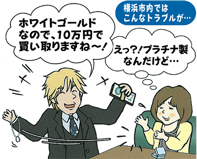 横浜市消費生活総合センターが定期的に発行している「相談月報(第137号)」によれば近年、各家庭を訪問して貴金属を買取る業者に関する問合わせが急増。「訪問業者にプラチナ製のネックレスをホワイトゴールドと鑑定され、少し不審に思ったが”10万円で買取る”とその場で現金を渡され思わず売ってしまった。よく考えたら安く買取られて後悔している」という60代女性の相談事例が、図と解説入りで詳細に紹介されている(右下イラスト参照)。