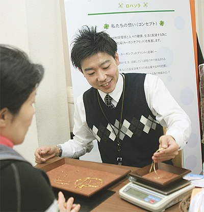 同店は基本的に競合店が頻繁に行っている折込広告や駅看板広告、紙面・雑誌広告を極力行わない事によって、その宣伝広告費を顧客還元する営業方針を確立。金やプラチナだけではなく、シルバーのアクセサリーやコインなどもその場で現金で買取ってくれる独自の高額査定が評判を呼び、開店以来、数多くのリピーターを抱える。さらに地域密着型サービスにも力を入れており「通行中の方や、いきなり店内に入りにくい方などでも気軽に立ち寄って頂けるようにと、店頭をはじめ店舗周辺の商店街や大型施設に立ってPRを行っています。また何度もご利用頂いているリピーター様への対応として”顧客管理システム”を導入。お客様個々のお取引内容や主なやり取りを詳細に記録する事で、例えば前回ご来店頂いた時に対応した担当者が休みであってもスムーズな対応ができる仕組みを構築しています」と話す。 さらに地域貢献の視点から、地球規模環境保全にも気を配り独自プロジェクト『ロハソラ』(ロハスと店名を併せた造語)を発足した。