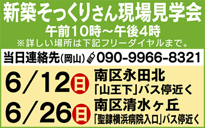 また、12日(日)・26日(日)には、それぞれ下記の会場で現場見学会も開催。ぜひ、この機会に、同社の耐震補強技術や施工品質・最新の住宅設備機器などを確かめてみては。本紙持参の来場者には粗品をプレゼント。
