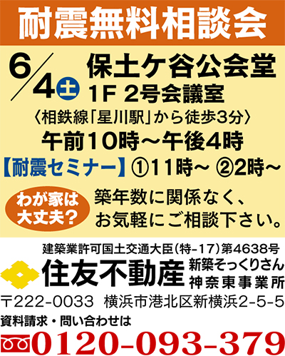 家を綺麗にしたいと思っても地震のことを考えると不安?家は強さがあって初めて、その美しさや設備の使いやすさが活きてくる。 そこでオススメするのが建て替えなくても耐震補強が出来る住友不動産(株)の「耐震無料相談会」。開催場所は保土ケ谷公会堂。当日は経験豊富なセールスエンジニアが応対。個別相談も可能なので、自宅の図面などを持参するとより詳しいアドバイスが聞ける。