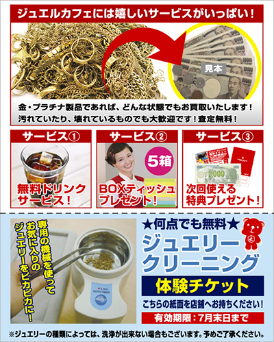 査定を待っている間に受けられる「ドリンク無料サービス」、貴金属買取成立時の「BOXティッシュプレゼント」、次回来店時に使える「査定額アップクーポン券の進呈」など、趣向に富んだサービスは”地域No.1(ナンバーワン)”を目指す同店の意気込みの顕れ。今なら読者限定「ジュエリークリーニング体験チケット」(左欄)も付いているのでぜひ利用しては?