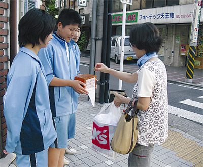 活動期間中は、放課後に松原商店街や天王町商店街で募金を呼び掛けた生徒達。お金を義援金の形で公的機関に渡すのではなく、「自分たちが主催者」という意識を強く持ち、募金に至る経緯主旨なども暗唱。必死に呼びかけを行う姿に、買物客からは「中学生が同じ中学生を救おうとする気持ちは大切だね」「頑張って。応援しているよ」という言葉や、ジュースなどの差し入れも。子ども達は、人とのふれあいや優しさを知り笑顔をみせていた。