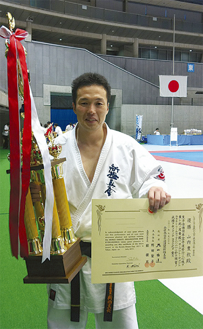 先月30日から2日間、都内にある東京体育館で開催された空手の全国大会「ドリームカップ2011」(新極真会主催)。男女年齢別のオープントーナメント形式で行われた同大会のうち、「35歳〜39歳の部」に出場した区内・岡沢町在住の山内豊秋さん(37歳・初段)が、優勝を果たした。