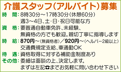 自然光を取り入れた明るく開放的なデイルームの中でも、特長的なのがお風呂。近隣で「嵐の湯・よこはま」を経営している同社では、那須塩原から天然温泉をタンクローリーで運搬。この施設でもこの温泉を使用しており、他所にはない充実の入浴タイムは早くも人気を集めている。見学や体験は随時OK。またスタッフも募集しているとの事(右下参照)なのでまずは一度、気軽に問合せてみては?