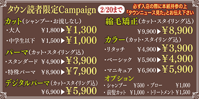 天王町駅から徒歩0分の美容室『ヘア・ループ』では2月20日(月)まで”タウンニュース読者限定キャンペーン”を実施中。本紙を持参すればカット料金(シャンプーなし)が1300円(中学生以下1000円)。さらにカラーやパーマなどの全メニューが通常料金の1000円OFF!「この冬の髪型はぜひお任せを」と来店を呼び掛けている。