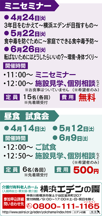 JR・保土ヶ谷駅が最寄の介護付有料老人ホーム「横浜エデンの園」(原田さち子園長)ではこの春も、生活に役立つ知識などを身に付ける事ができる「ミニセミナー」を開催する。