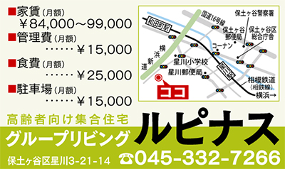 居室数10室と小規模施設ならではのアットホームな雰囲気も魅力的な「ルピナス」では、1階の食堂ホールを一般に開放する楽しい企画を展開。「歌声教室(※今号中面に詳細記事あり)の開催や、今週末からは近隣の保土ケ谷公園へ花見に訪れた人のお休み処となるカフェを行う予定となっている。また施設の無料見学相談会や相談は随時実施しているので(要事前予約)、まずは一度気軽に問合せてみてはいかが?