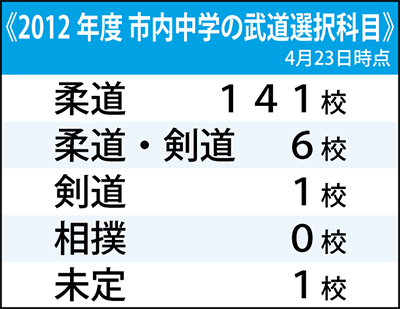 1・2年生の保健体育の授業で必修化された「武道」は柔道、剣道、相撲の3種目の選択制。市内149校のうち、141校が柔道、6校が柔道・剣道の両方、1校が剣道を選択する意向で、1校が未定としている。