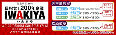 天王町の着物店「いわきや」でこのほどスタートする着付け教室は1回500円のお手頃価格。初級・中級の各コース週1回2時間、4カ月単位で実施される(詳細は下欄参照)。さらに帯板購入で9回分の授業が無料に。この価格なら、誰でも気軽に始められそう。