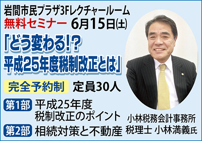 内容は『平成25年度税制改正のポイント』と『相続対策と不動産』で講師は小林税務会計事務所の税理士小林満義氏が務める。時間は午後3時30分から5時30分。完全予約制で定員30人。積水ハウス担当者は「皆様には、相続対策を真剣に考える機会にして頂きたい」と話す。