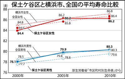 保土ケ谷区の平均寿命(0歳の平均余命)は、男性が80・3歳で女性は86・2歳。前回(05年)調査時から、男性は0・4歳アップし、全国平均を上回った(市平均と同値)。女性は前回と変わらず、全国と市の平均を下回った。