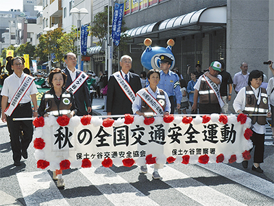 当日は、保土ケ谷交通安全協会(板橋悟会長)をはじめ、地域の交通安全関連団体らが参加し、パレードを実施。鈴木和宏区長、横田善信保土ケ谷警察署長らを先頭に、西谷中学校吹奏楽部によるマーチング演奏にあわせて天王町商店街を行進した。