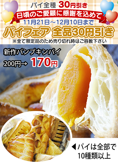 期間中は、時間をかけてじっくり煮込んだりんごのコンポートが自慢のアップルパイや、程よい甘さが人気の新作パンプキンパイなど、全10種類以上のパイが通常価格から30円引きに。更にクロワッサンやカレーパン等、パイ以外の人気商品も一部30円引きとなる。