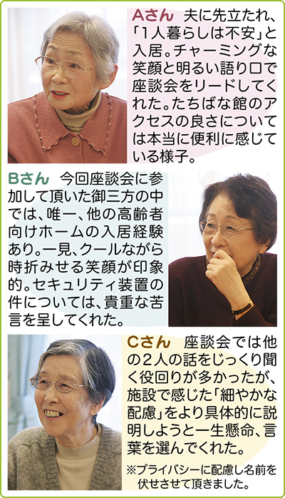 ―皆さん、それぞれ入居されたタイミングは違うとは思いますが、ほかの高齢者向け住宅ではなく、この「たちばな館」に決められた理由をお聞かせ下さい。
