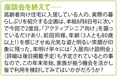 60歳以上であれば、1人でも安心して暮らせる新しいタイプの賃貸マンションとして、今年春に区内・天王町に誕生した『サービス付き高齢者向け住宅・たちばな館』。今回は、同所に実際に入居している3人のアクティブシニアに協力してもらい初の「座談会」を開催。入居者の生の声から、施設の魅力や課題などに迫った-。