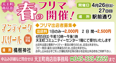 このフリマへの出店希望者の受付は4月5日(土)午前10時から天王町コミュニティセンター1階で開始される。参加費は1日のみ2000円、2日間通しが2500円。詳細問合せは下欄参照のこと。