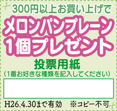 今回のイベントは、左下の投票用紙(記入したもののみクーポンとして有効)に好きなメロンパンの種類を記入し、店頭で投票を行ってもらうもの。1位に輝いたメロンパンは、その後1周年の「感謝キャンペーン」で還元していくという。