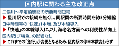 区内の駅利用者に関わる変更は、「各停」の所要時間短縮。これまで星川駅での「快速」との接続を行っていたが、今回の改正により接続を無くす。この変更により、二俣川〜平沼橋間の所要時間が約3分短縮。同区間の利便性と速達性が向上する。