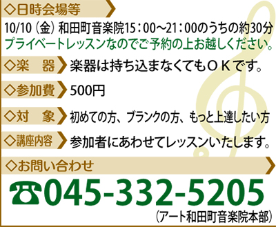 新しい趣味や習い事を気軽に発見してもらおうと、ワンコイン(500円)というリーズナブルな料金設定で企画されたこのレッスン。ギターや声楽などをテーマに毎回好評を博しており、今回は「チェロ」について、同音楽院の実力派講師=写真が、大切な基本技術などを丁寧にレクチャーする(※詳細は左欄)。