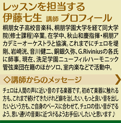 興味があってもなかなか親しむ機会の少ない楽器「チェロ」を始めてみたい人に最適なレッスンが「和田町音楽院」(和田町駅そば)で行われる。
