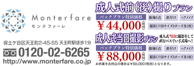 同じくチャペルで撮影する成人式プランも受け付けている。お得な前(後)撮りプランのほか、成人式当日に撮影して直行バスでそのまま式典会場(新横浜)まで送ってもらえる当日撮影プランも。前(後)撮りの申込みでも、成人式当日に直行バスを利用することもできるので、保土ケ谷区在住者にはぜひおすすめしたい。また10月末までの予約で、1ポーズ1枚のサービスもあり。