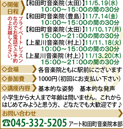 プライベートレッスンで「声楽」が学べる教室を、「和田町音楽院」(和田町駅そば)が初心者を対象に開講。参加者を募っている。